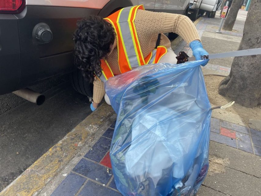 After a brief gathering, every volunteer was provided with a simple set of supplies: A pair of plastic gloves, a large trash bag, and a trash picker with the San Francisco Public Works logo on it. Soon, the crowd broke into groups and began picking up litter along the Mission Street corridor.