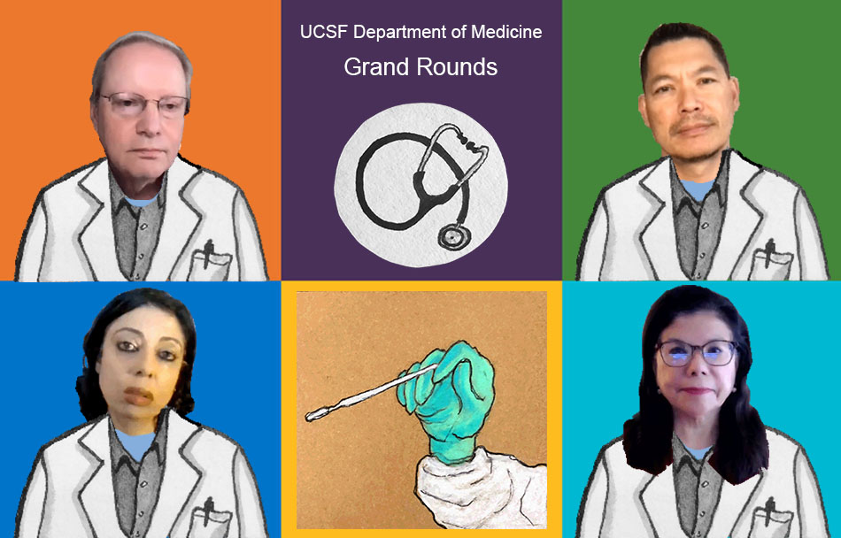 UCSF's Department of Medicine Grand Rounds on March 3, 2022 included (from top left): Bob Wachter, Peter Chin-Hong, Monica Gandhi and Yvonne Maldonado. Illustration by Molly Oleson; photos from screenshots of live event.