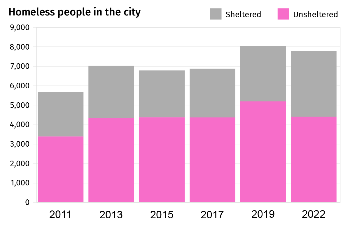Overall, 7,754 homeless people – those with and without shelter – were counted in the city during the nighttime tally on February 23. Some 8,035 were counted during the 2019 tally.
