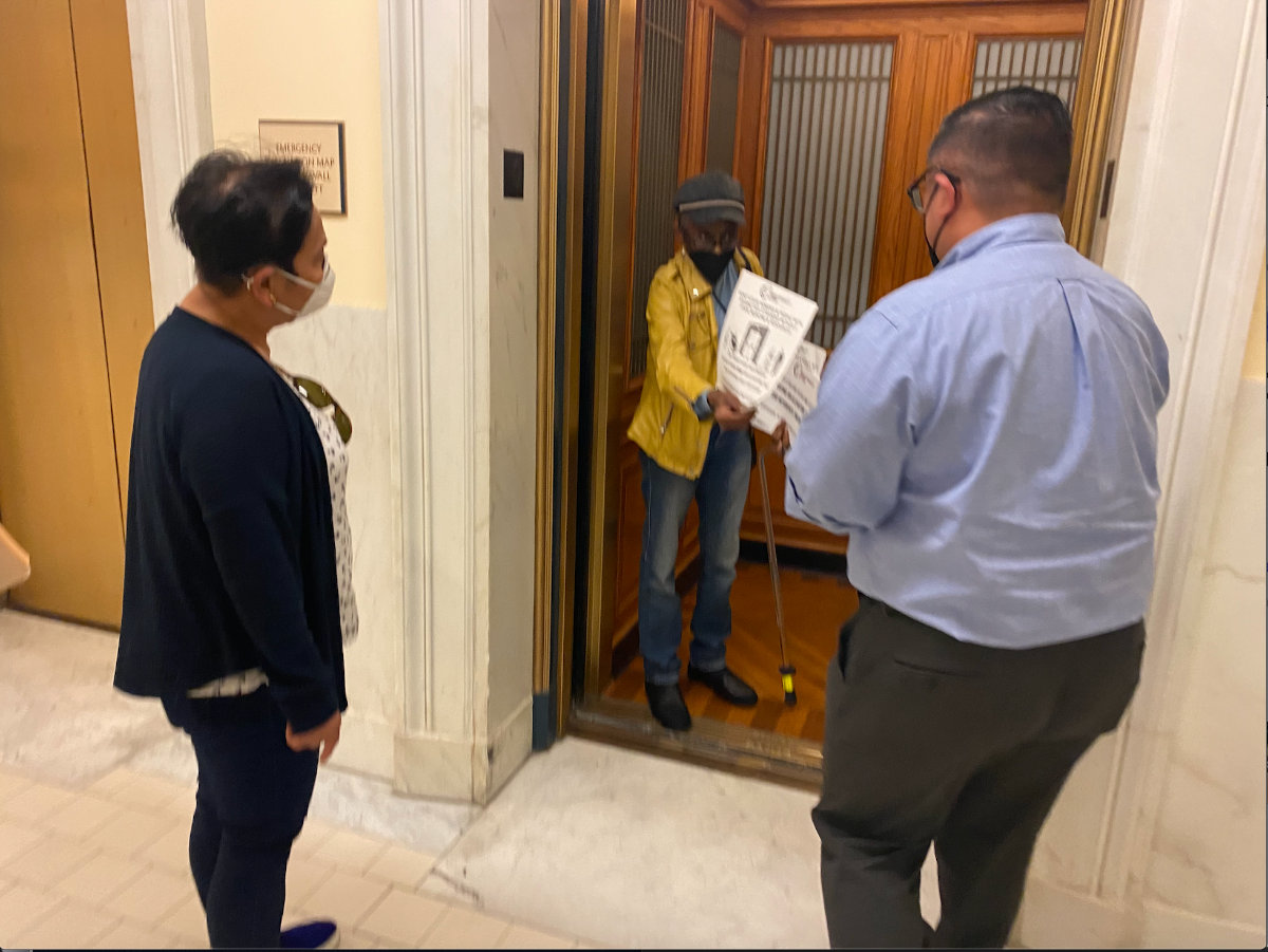 Members of the activist group Senior & Disability Action filled three elevators on the east side of City Hall on Wednesday to demonstrate the neglected elevator conditions in Single Room Occupancy Hotels, or SROs, and prevented about 20 politicians and other City Hall workers from using them.