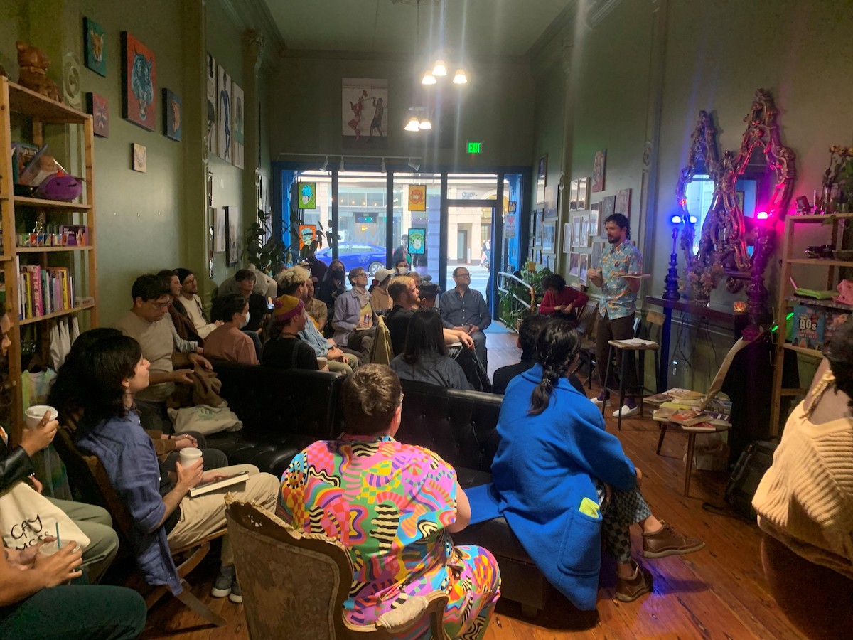 When Queer Bedtime Stories transitioned to in-person gatherings last September, there was little question that the Milk SF cafe should host. It was owned by a lesbian couple, named after Harvey Milk, and flush with inviting and political decor, such as the rainbow staircase. Plus it was near Sessionsโ house, and screamed cozy โ the couches begged for someone to sink in.