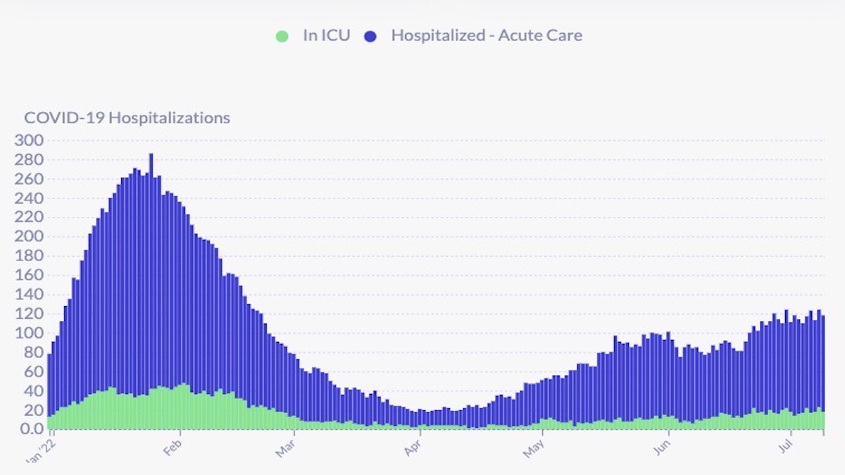 Over the past week, hospitalizations remain flat although there were ups and down during the week. On July 9, DPH reports there were 118 covid hospitalizations, or about 13.5 covid hospitalizations per 100,000 residents (based on an 874,000 population). ICU patients had climbed to 23, but have fallen back to 18. The California Department of Public Health reports 128 covid patients in SF hospitals with 23 patients in ICU as of July 12.