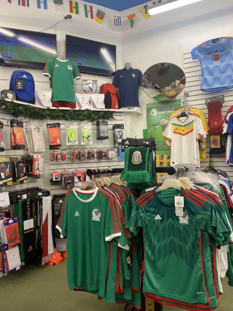 Several soccer stores along Mission Street were streaming the matches live. Elite Sports on Mission Street carries gear from countries across the globe, with an especially robust collection of Mexico paraphernalia, including jackets, accessories, soccer balls and cleats.