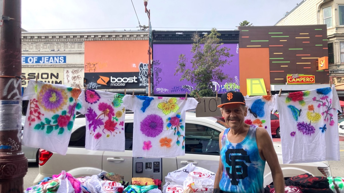 He’s at his current location, around 2763 Mission St., from Wednesdays to Sundays, selling T-shirts.