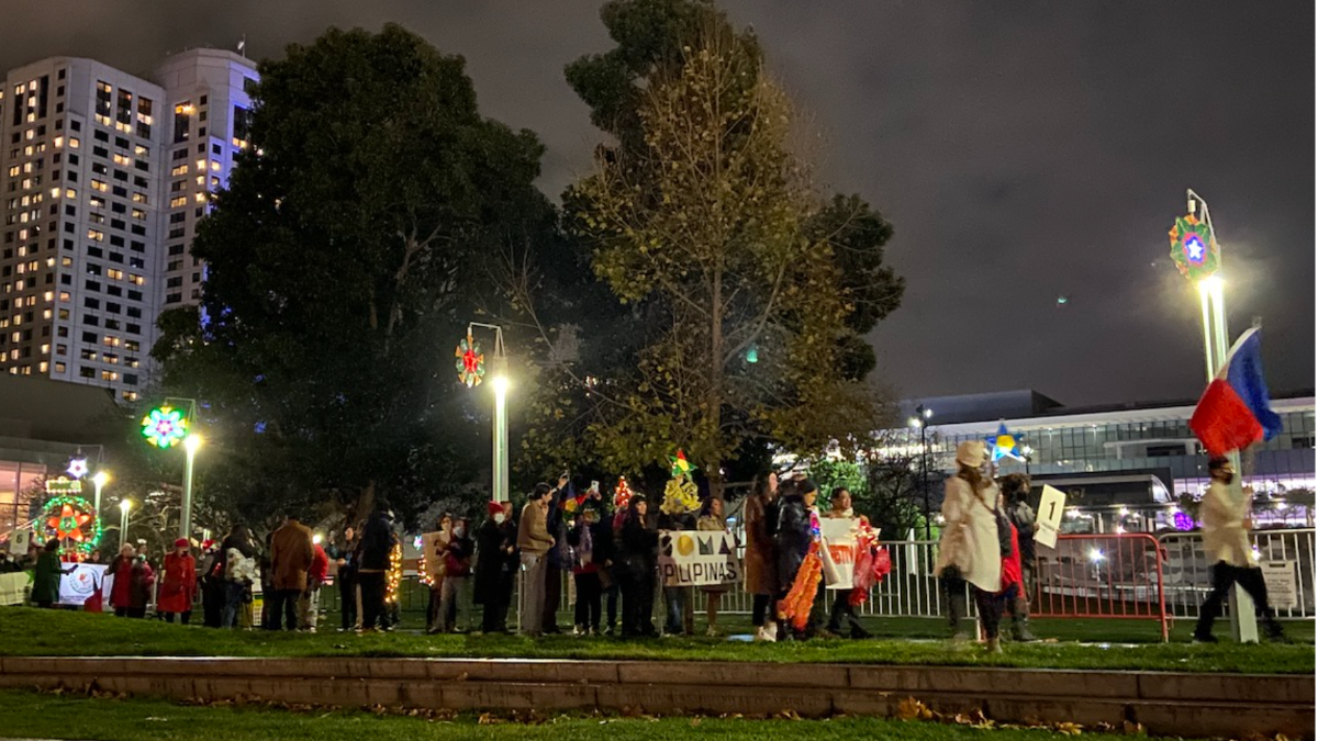 “¡PAROL STROLL! PAROL STROLL!”, gritó alguien momentos antes. Era la señal: Una fila de ancianos, familias, activistas y adolescentes salieron del Yerba Buena Center for the Arts y comenzaron la procesión en Yerba Buena Gardens. Su paseo pasaría por la iglesia de San Patricio, en las calles Mission y Fourth, y rodearía lentamente la cascada iluminada del jardín.