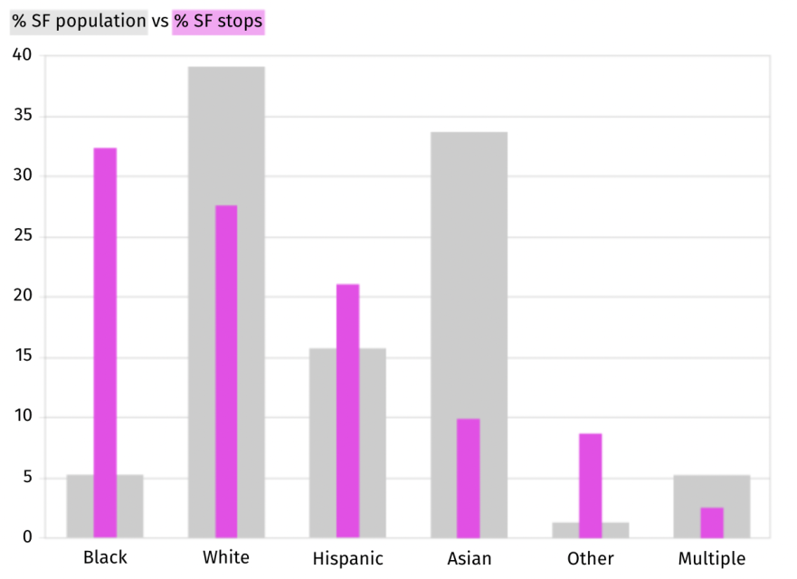 Los datos muestran que los negros de San Francisco se han visto abrumadoramente afectados por las identificaciones por infracciones leves del código. Y, en la mayoría de los casos, no se les cita: otro indicio de que los prejuicios raciales pueden ser un factor en las identificaciones, y que la infracción de tráfico no era el único objetivo.