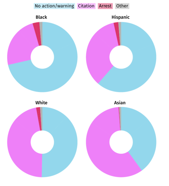 En SF, casi tres cuartas partes de los negros fueron dejados con una advertencia o ninguna acción después de una infracción sin movimiento.