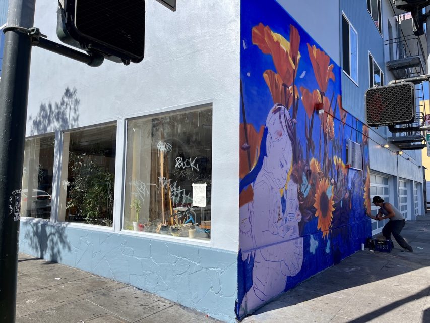 The piece Arroyo’s working on is a huge mural that spans the outside of a new, not yet open, bakery, Fox & Lion Bread. It’s a beautiful orange, blue and purple forest of sunflowers, poppies, leafy plants, Mission Blue butterflies and Victorian houses. One side of the painting is taken up entirely by the hopeful figure of a young girl: Lupita Louise Araiza Uribe, or Lulu, the third generation in a family of female Mission muralists.