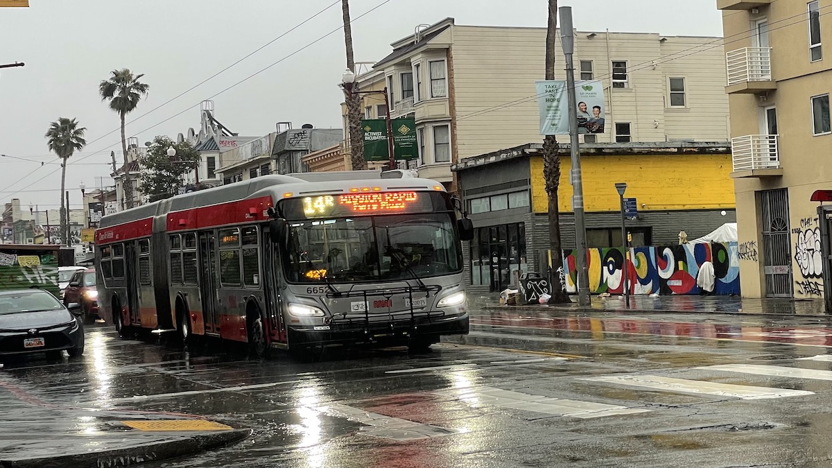 Muni bus on Mission. Taken Feb. 27, 2023. Photo by Christina MacIntosh.