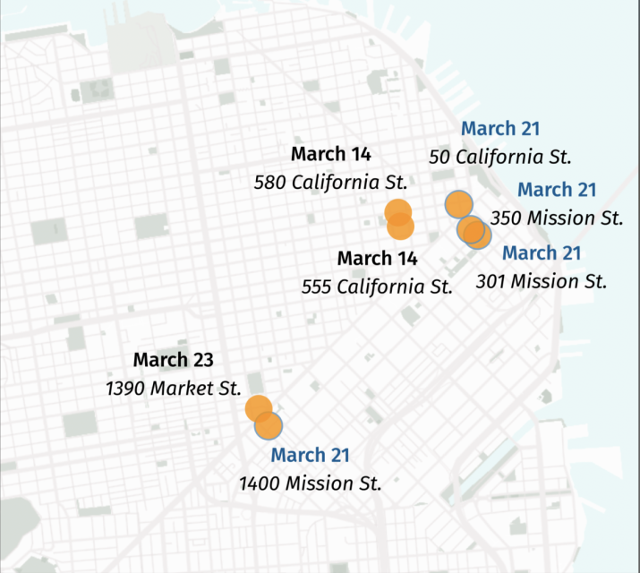 - 350 Mission St. (Salesforce Tower East, which had broken or cracked windows on floors 11 through 30), March 21;