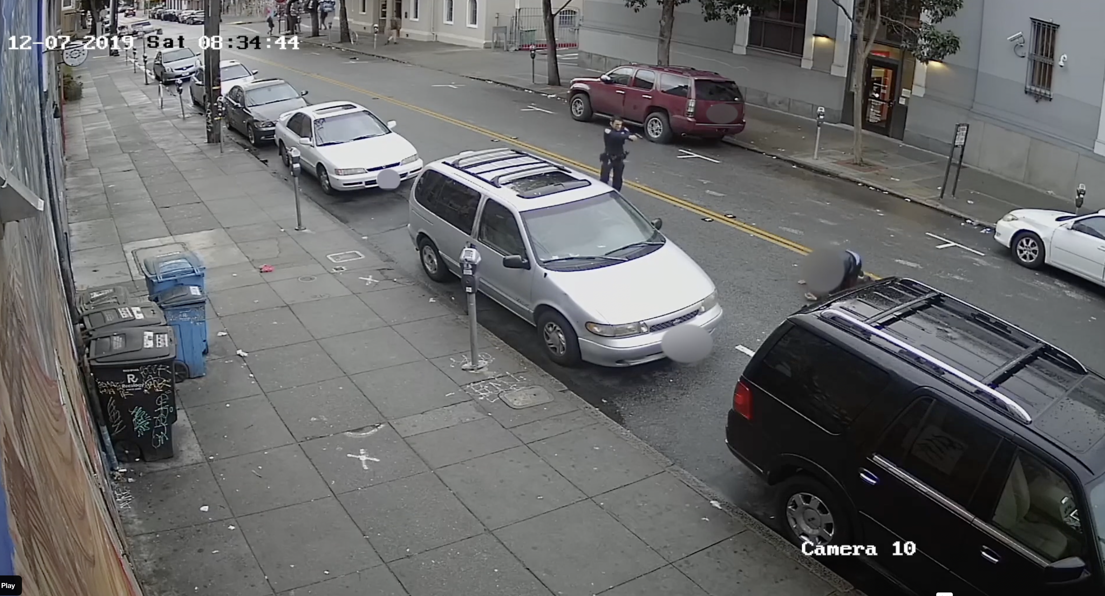 Surveillance footage then shows Flores, pistol drawn, approaching to within roughly five yards of Hampton. Flores shoots the suspect once while Hampton was staggering and crawling on the ground. After Flores fired a single shot, Hayes repeatedly yells “Stop, stop, stop!”