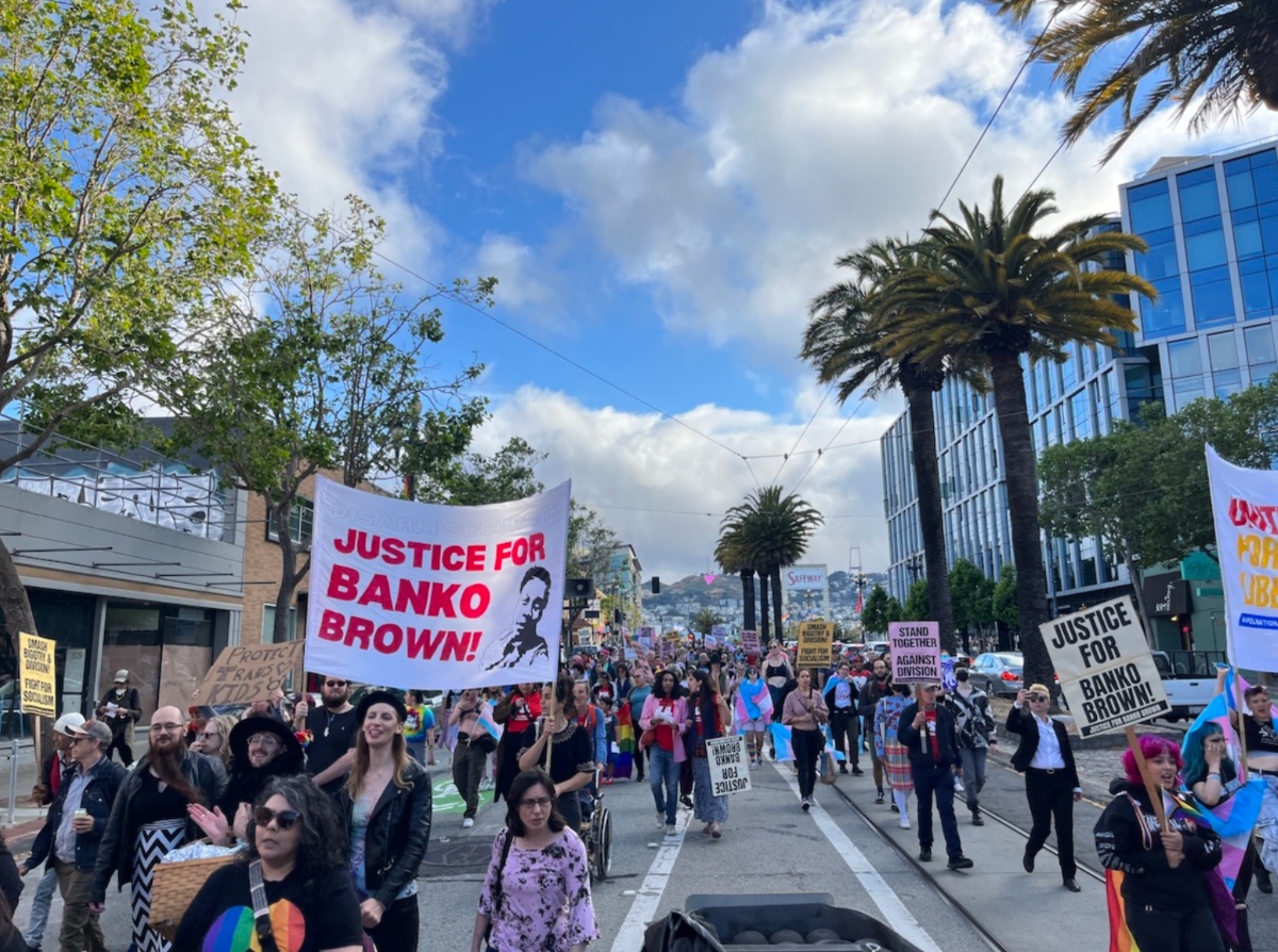 Al paso de las filas de gente, muchos pedían justicia y enarbolaban pancartas con retratos y homenajes a Banko Brown, un hombre trans negro de 24 años asesinado por un guardia de seguridad de Walgreens en el centro de San Francisco el 27 de abril.