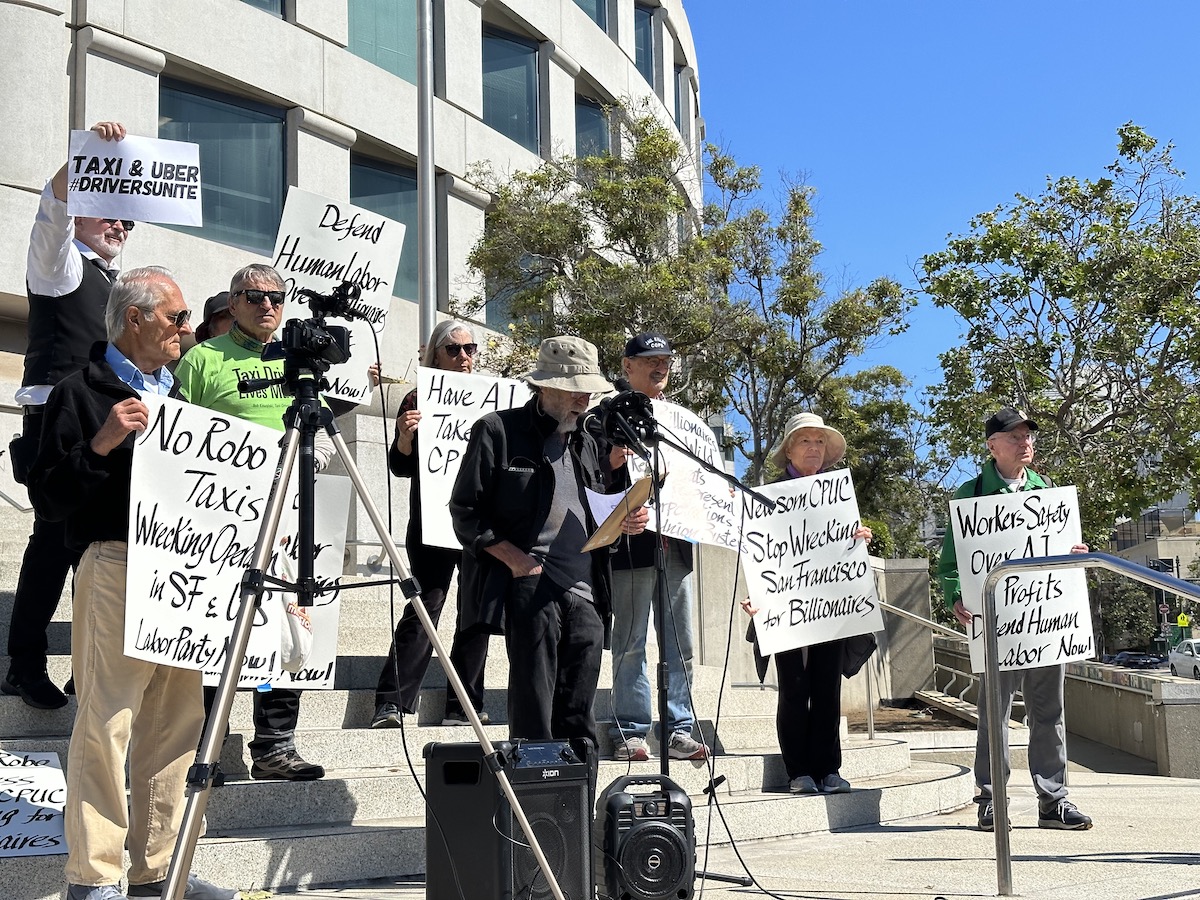 “We’re here to send a message to the CPUC: put the brakes on Waymo and Cruise!” Mark Gruberg, member of the SF Taxi Worker Alliance, said to an attentive crowd Thursday at 10 a.m., standing on the steps of 505 South Van Ness Ave.