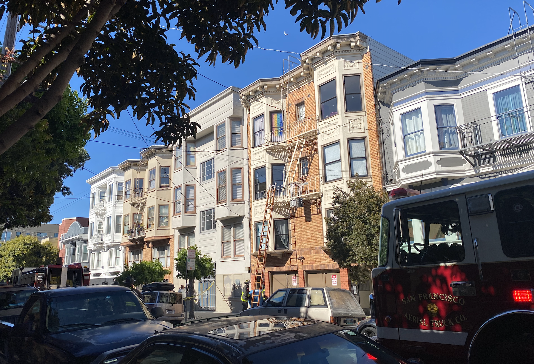 None of the tenants in the eight-unit building was injured. SFFD said it requested Red Cross for one displaced person. The tenant in the apartment where the fire originated was out of town on vacation. He was informed by his fellow tenants of the fire, and will be home in a few hours, according to his fellow tenant, Paula Groves.
