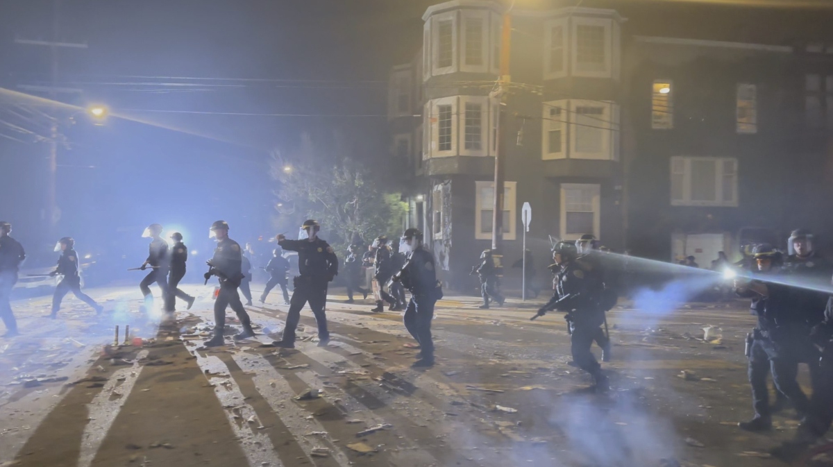 SFPD has rushed the crowd assembled at 25th & Harrison, aiming rubber ball rifles at the crowd, which quickly dispersed