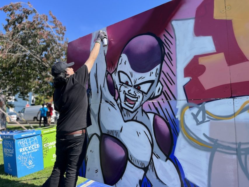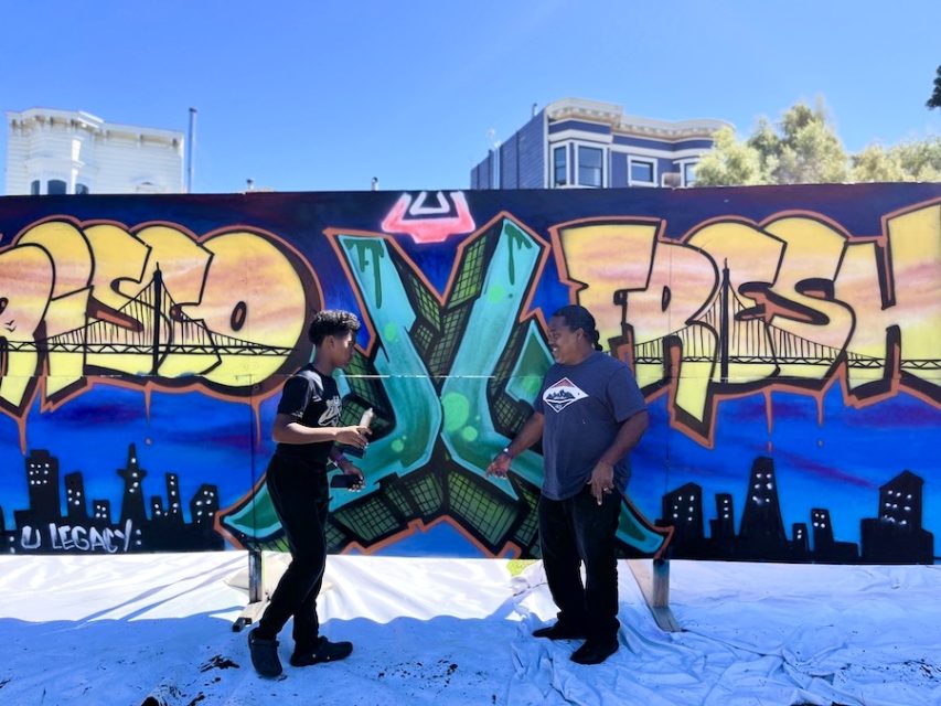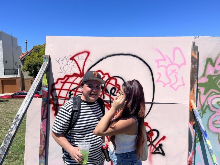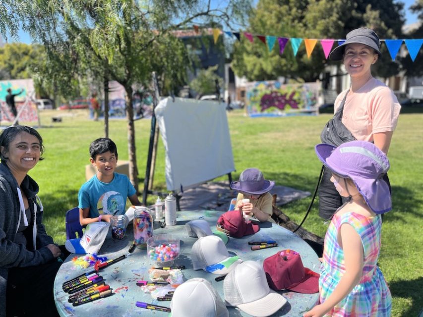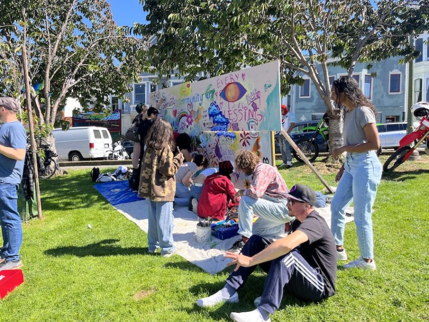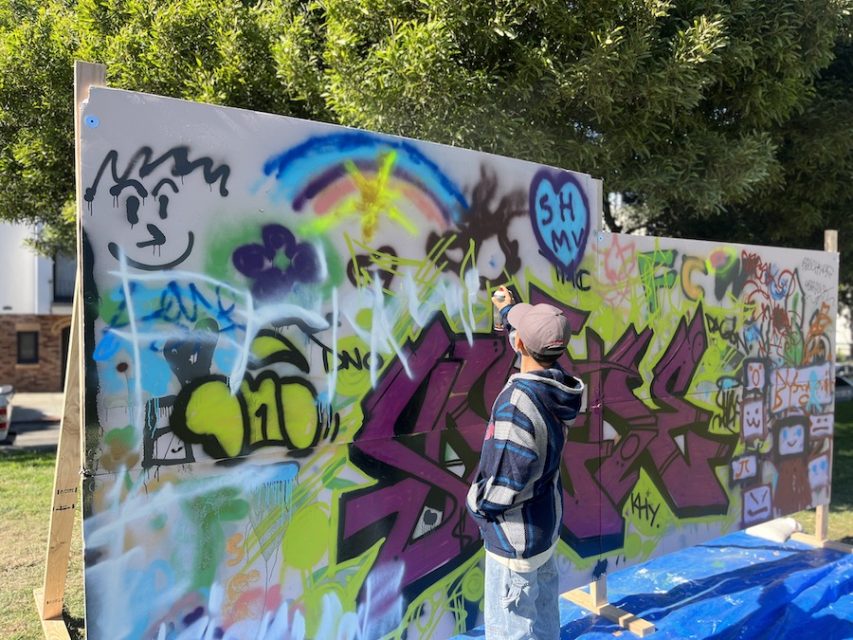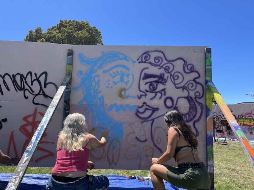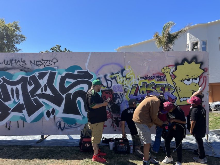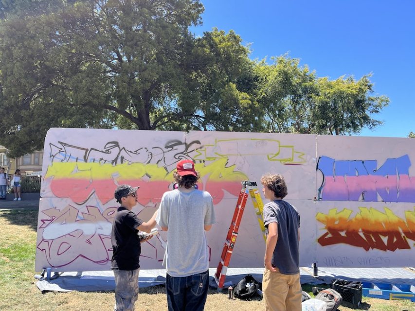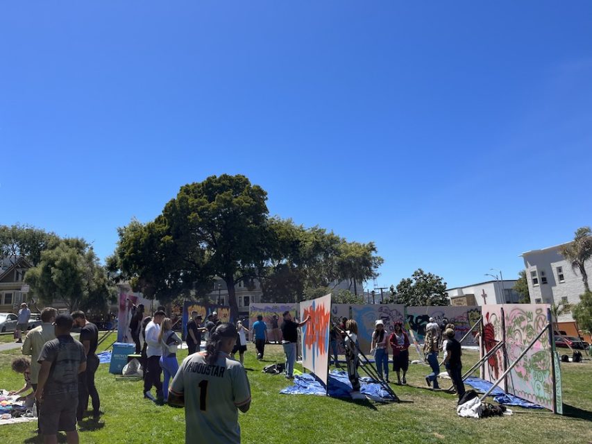 Around 1 p.m. on Saturday, a cluster of 8-by-20-foot wood panels stood blank along the western end of Precita Park, reflecting the sun. Within minutes, a stream of smiling parents, toddlers in tow, made their way among the panels, setting down crates of spray paint and greeting each other with fist bumps and hugs.
