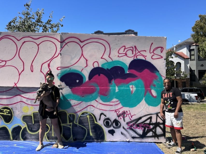 A few panels away, Marcella Ortiz alternated between spraying and chasing after her two daughters, Rosario, 1, and Amaya, 3. Growing up in the Excelsior in the ‘80s and ‘90s, she said, she loved doing graffiti.