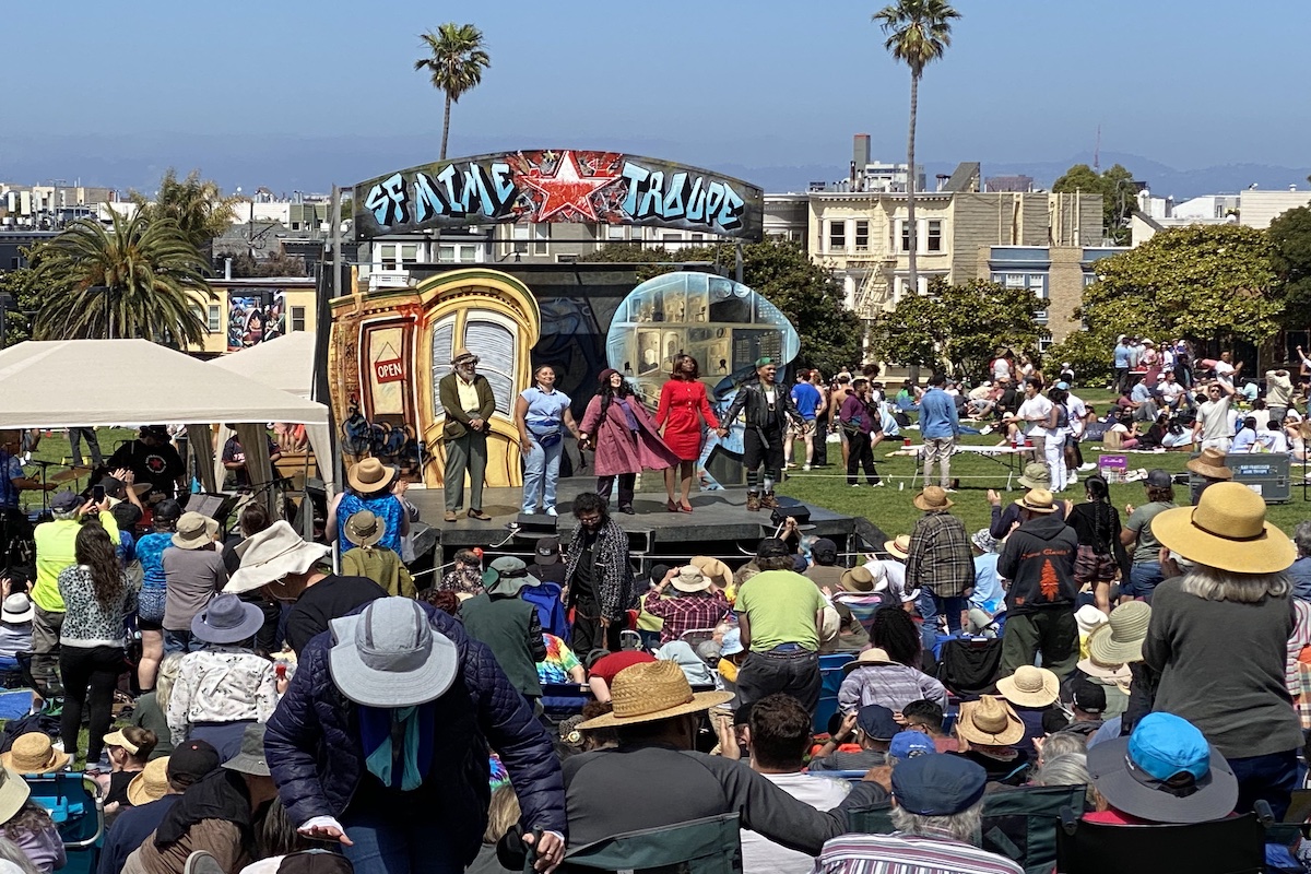 On the con side, a story about a story often calls for some nuance and a relatively complex plot that can be difficult to follow in a park distracted by dogs, volleyball players, odd tattoos, vendors of margaritas and edibles. So when “the story” gets confronted by “the reality” of the Tenderloin, the musical breaks down into loosely linked scenes, then wanders and finally ends with a sigh.