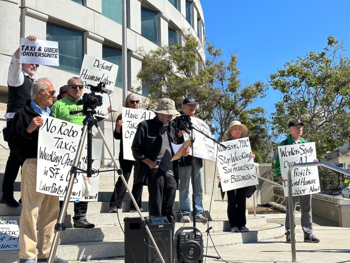 “Estamos aquí para enviar un mensaje a la CPUC: ¡poned freno a Waymo y Cruise!”. dijo Mark Gruberg, miembro de la SF Taxi Worker Alliance, a una audiencia atenta el jueves a las 10 de la mañana, de pie en los escalones del 505 South Van Ness Ave.