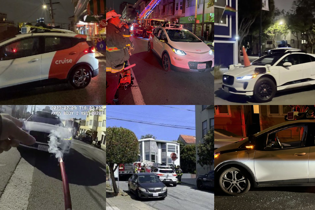 - On Jan. 24 at Laguna and Hayes streets, a Cruise autonomous vehicle “rapidly approached” firefighters extinguishing an outdoor fire. It came to a stop between them and their engine — and atop their hose. Firefighters were unable to move the car; after several minutes, an operator was contacted via the car’s intercom, and it was moved after several more minutes.