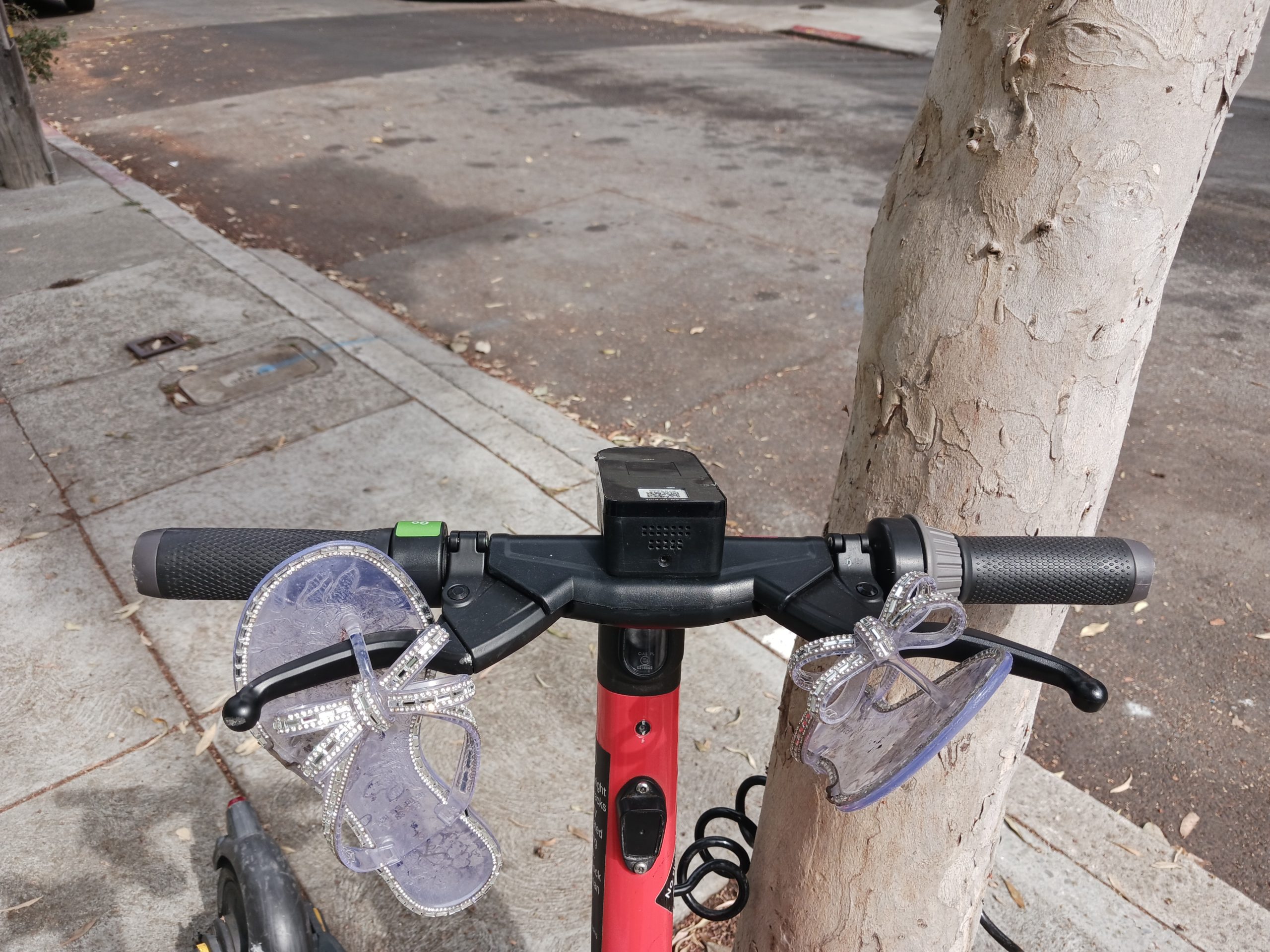 A bicycle is parked on a sidewalk next to a tree with a pair of silver sandals on it.