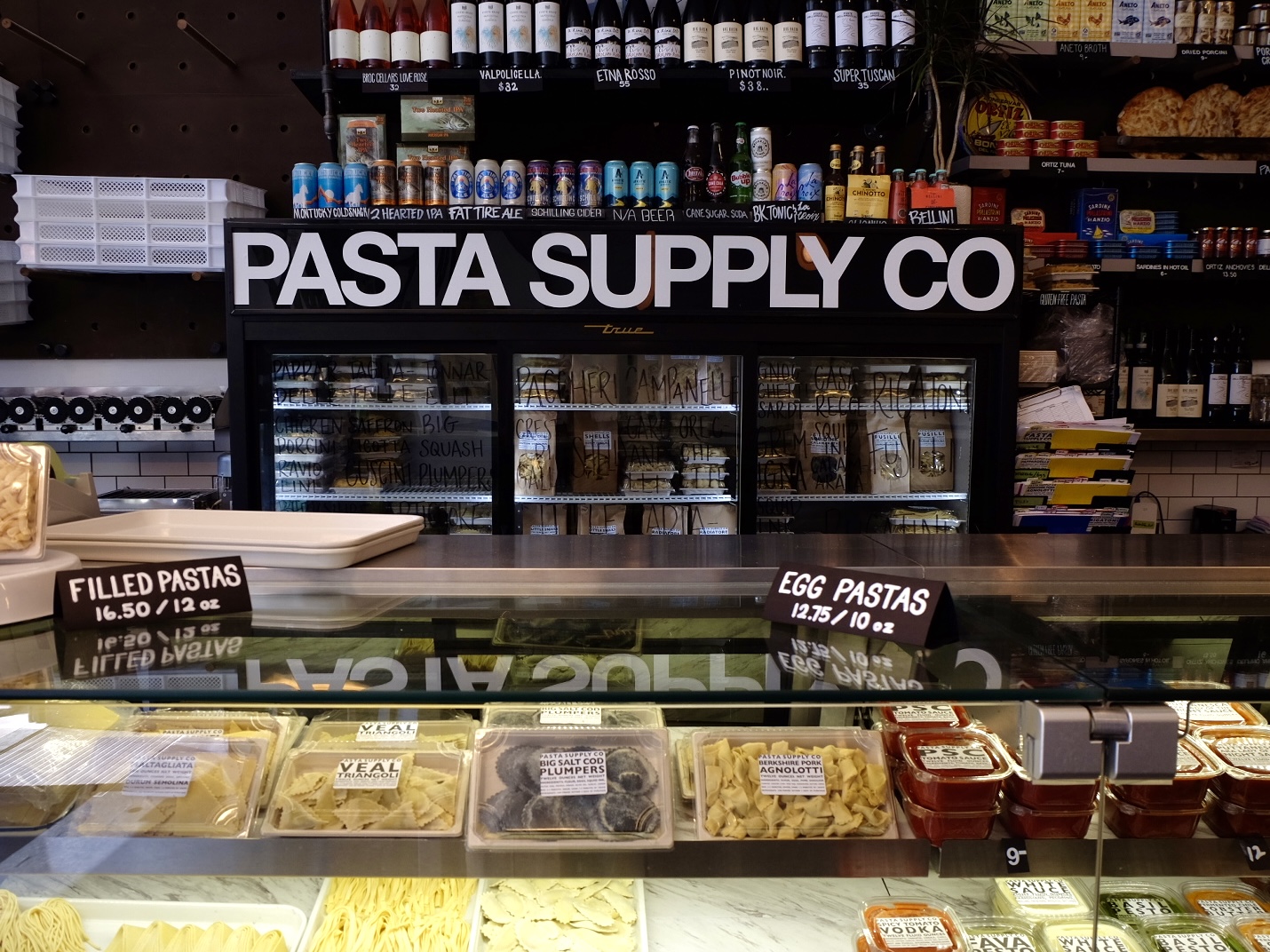 During the day, customers will be greeted by four glass display cases filled with more than 30 types of pastas, more than 20 sauces, and Strong’s “favorite butter on the planet,” from Hope Creamery in his home state Minnesota.