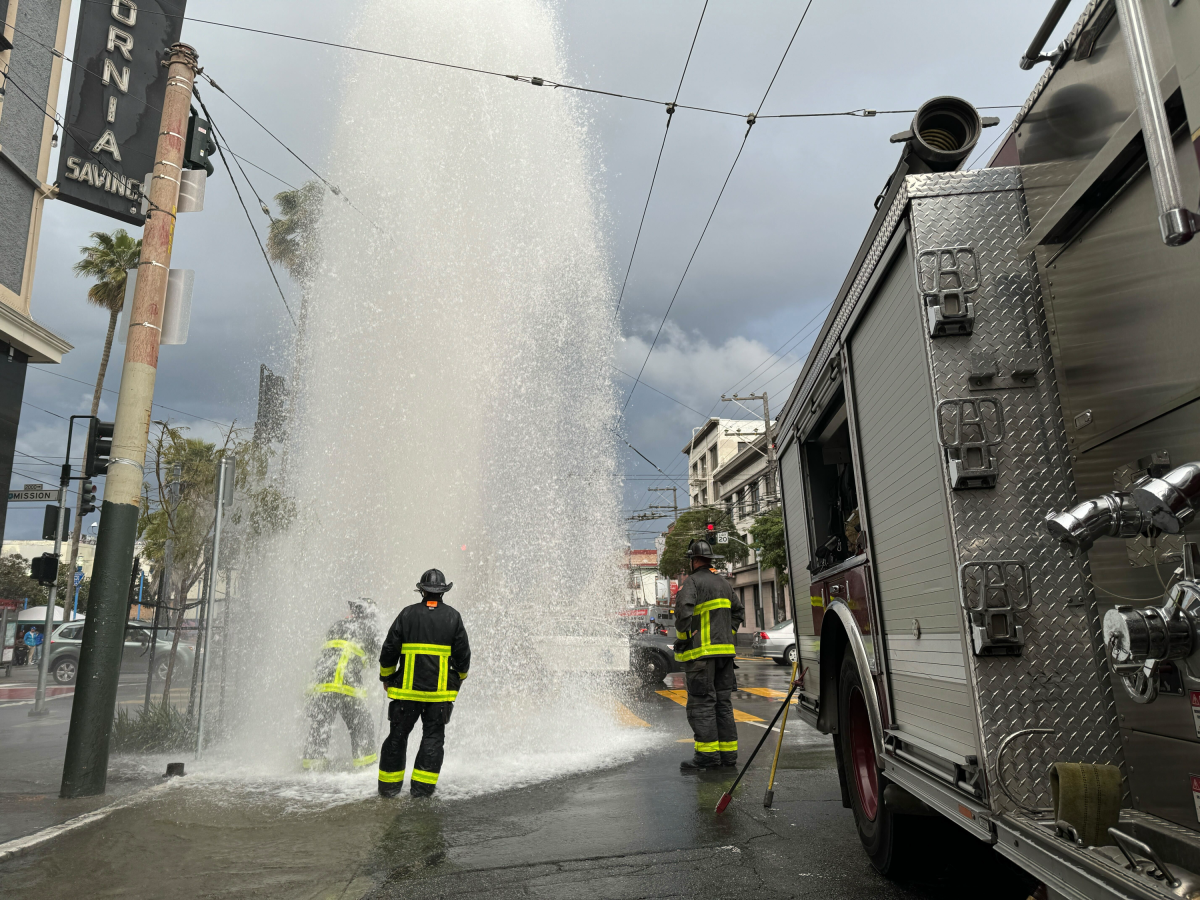 Around 6 p.m. today, a white truck struck a fire hydrant at 16th and Mission streets, causing an eruption of water that briefly flooded the intersection.