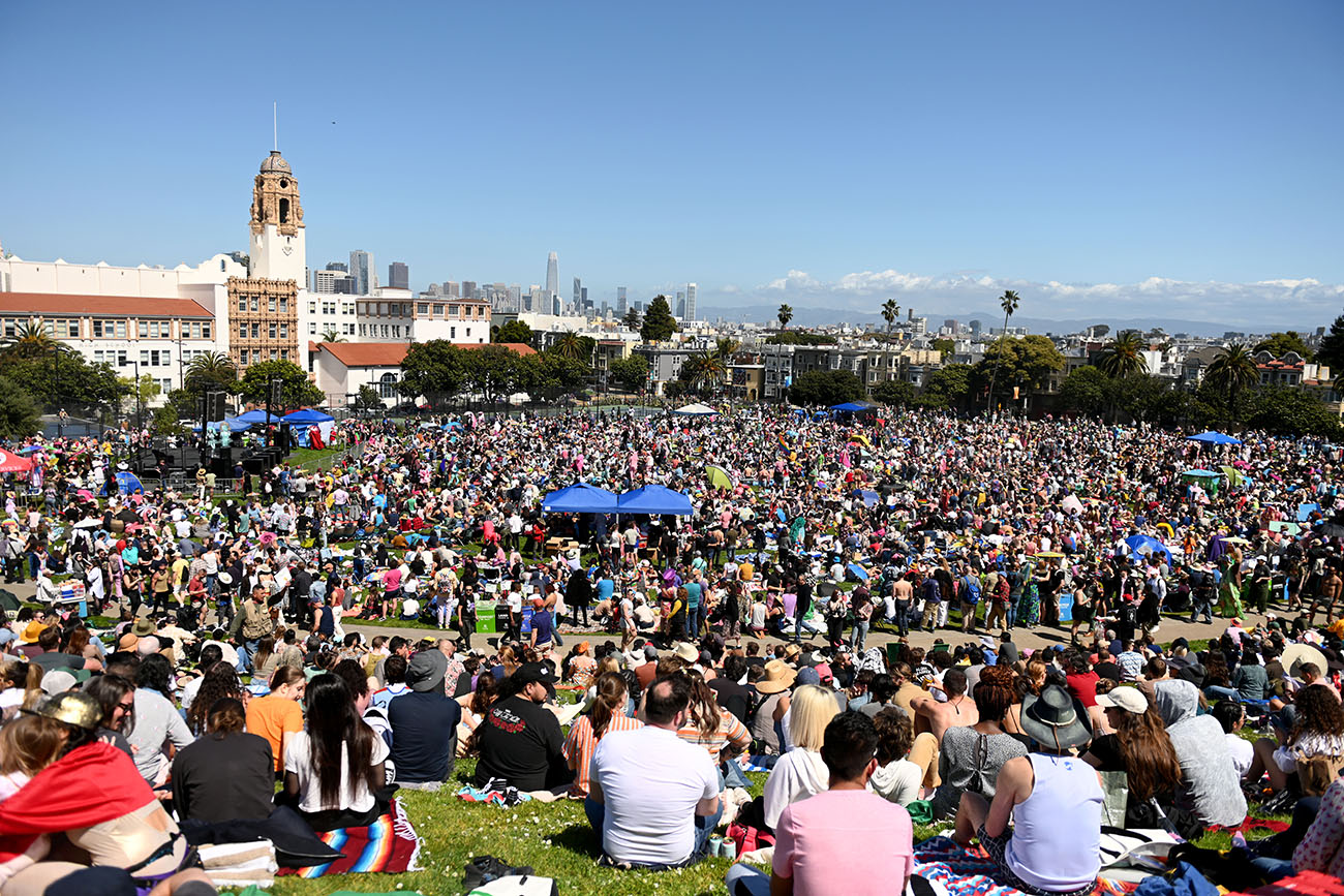 Thousands pack Dolores Park in San Francisco, Calif., on Sunday, March 31, 2024. “Jesus Ken” won the 2024 Hunky Jesus competition, which is put on annually on Easter by the Sisters of Perpetual Indulgence. Photo by Aaron Levy-Wolins.