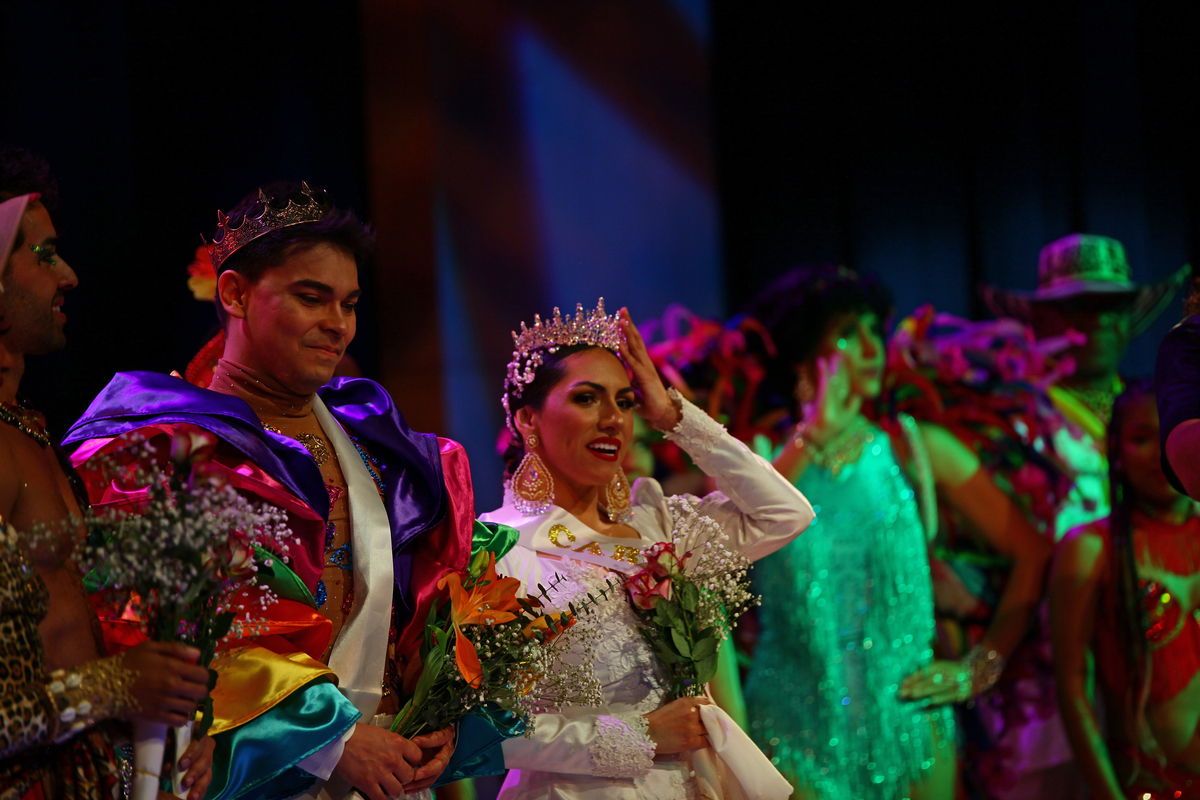 Carnival King Yeison Andres Jimenez and Carnival Queen Monica Mendoza pose at Carnaval San Francisco King and Queen Dance Competition at KQED headquarters on March 30, 2024.