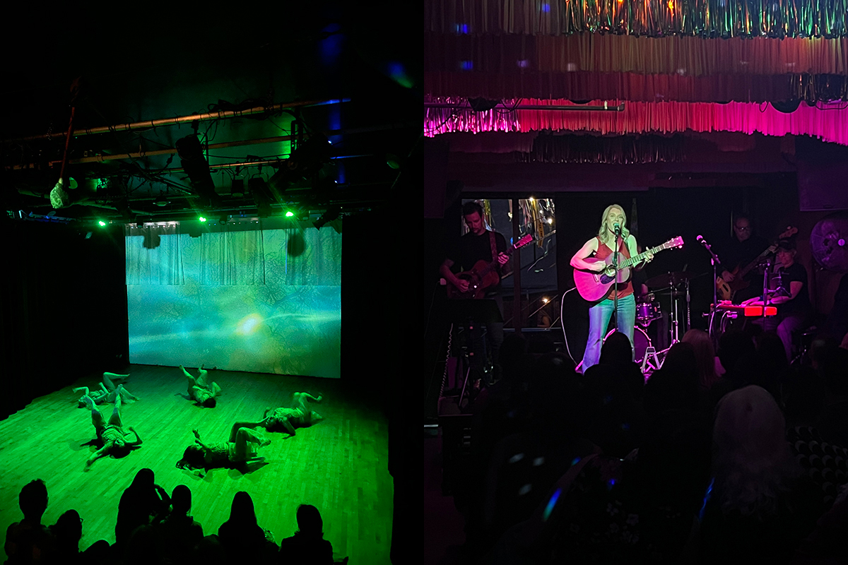 The image split into two shows a dance performance with green lighting on the left, and a singer with a red guitar performing on stage with a band on the right.