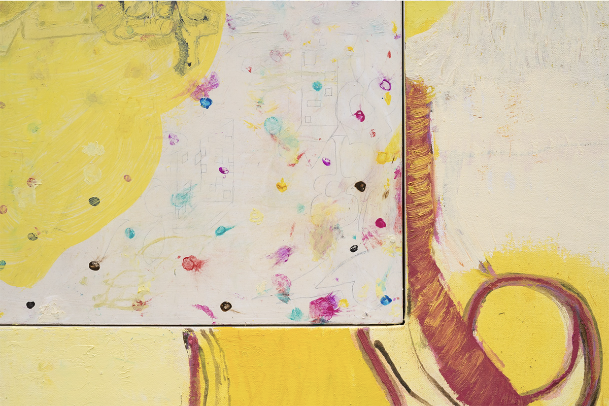 The show’s tile, “Xerox,” can mean the copy machine itself, the black-and-white copies made by the machine, the international corporation, or the process that Delacruz uses to construct the images for his paintings. Jordan Stein, who runs Cushion Works, writes that Delacruz is often drawing, photocopying drawings, and cutting photocopies together to make new drawings. There is a folder on his phone called “Xerox dreams” that holds these images.