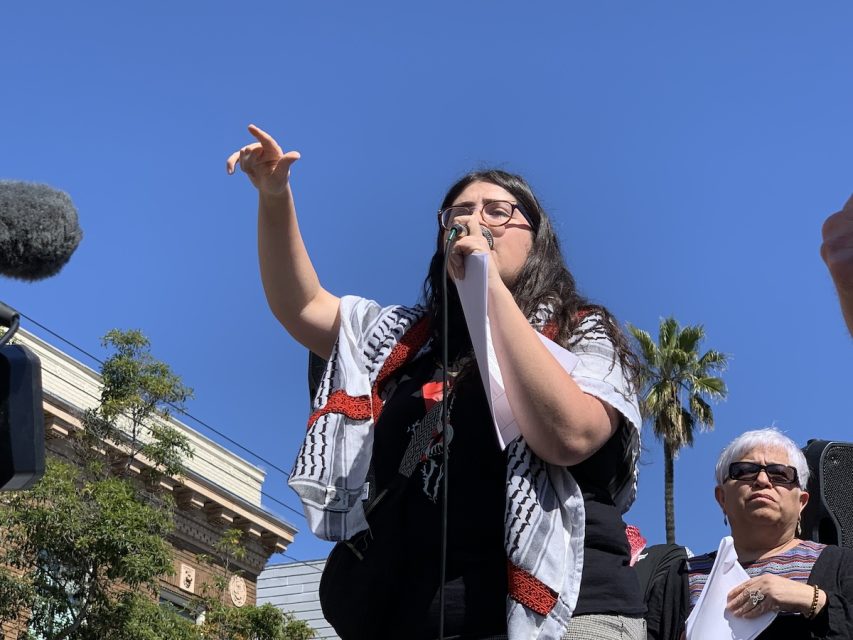 A member of the Palestinian Youth Movement addresses the crowd at the May Day march on May 1, 2024. Photo by Eleni Balakrishnan