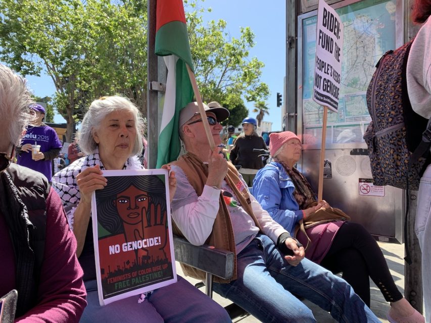 Reem Assil, the Palestinian owner of Reem’s California restaurant at 25th and Mission streets, called on the crowd to come together to fight for justice “for all oppressed people,” whether by boycotting or withholding labor or refusing to participate in institutions that perpetuate injustices.