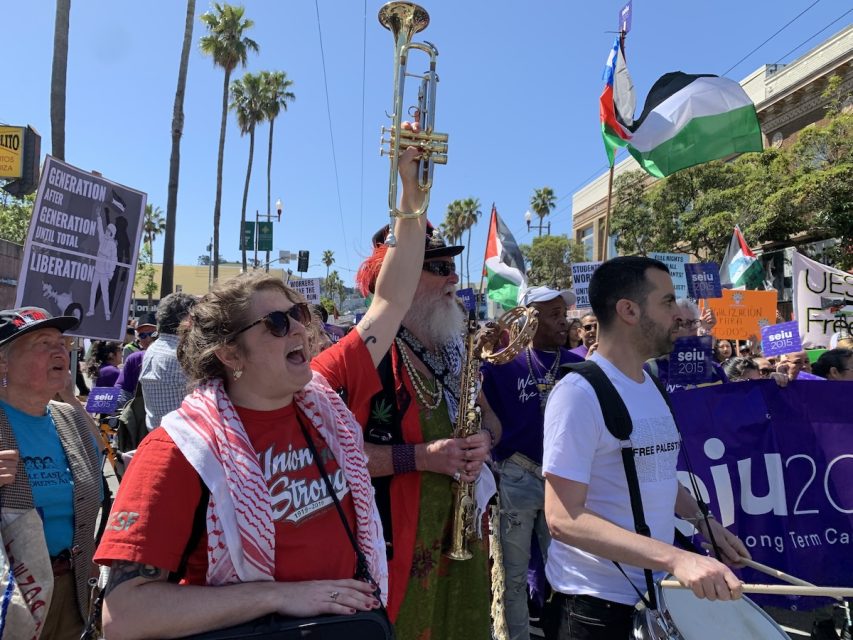 Hundreds of workers gathered at the 24th and Mission plaza this morning to celebrate May Day, and this year, the ongoing war on Palestine is high on their list of priorities.