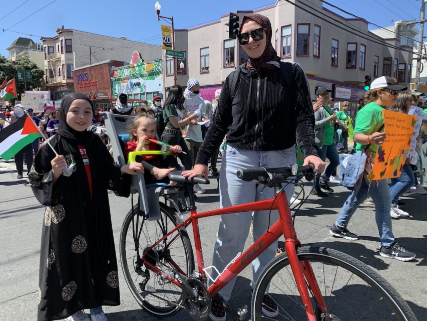 Protesters at times spanned an entire block of Mission Street, as police flanked both sides. The event had its own security people, too, wearing yellow vests and riding bicycles. As the crowd passed, residents looked on and raised peace signs, or called out “Free Palestine!” in solidarity.