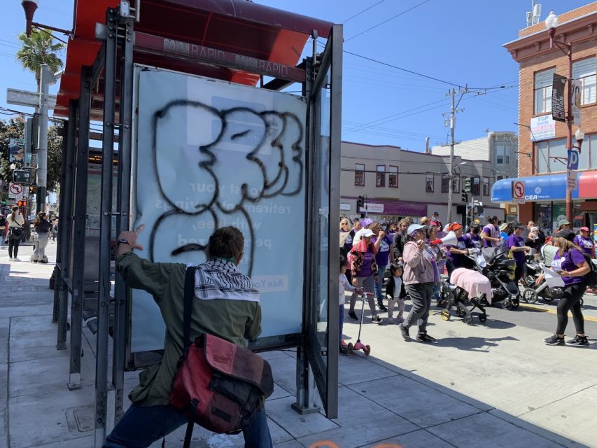 A man spray paints “Free Gaza” on a bus stop during the May Day workers march on May 1, 2024. Photo by Eleni Balakrishnan
