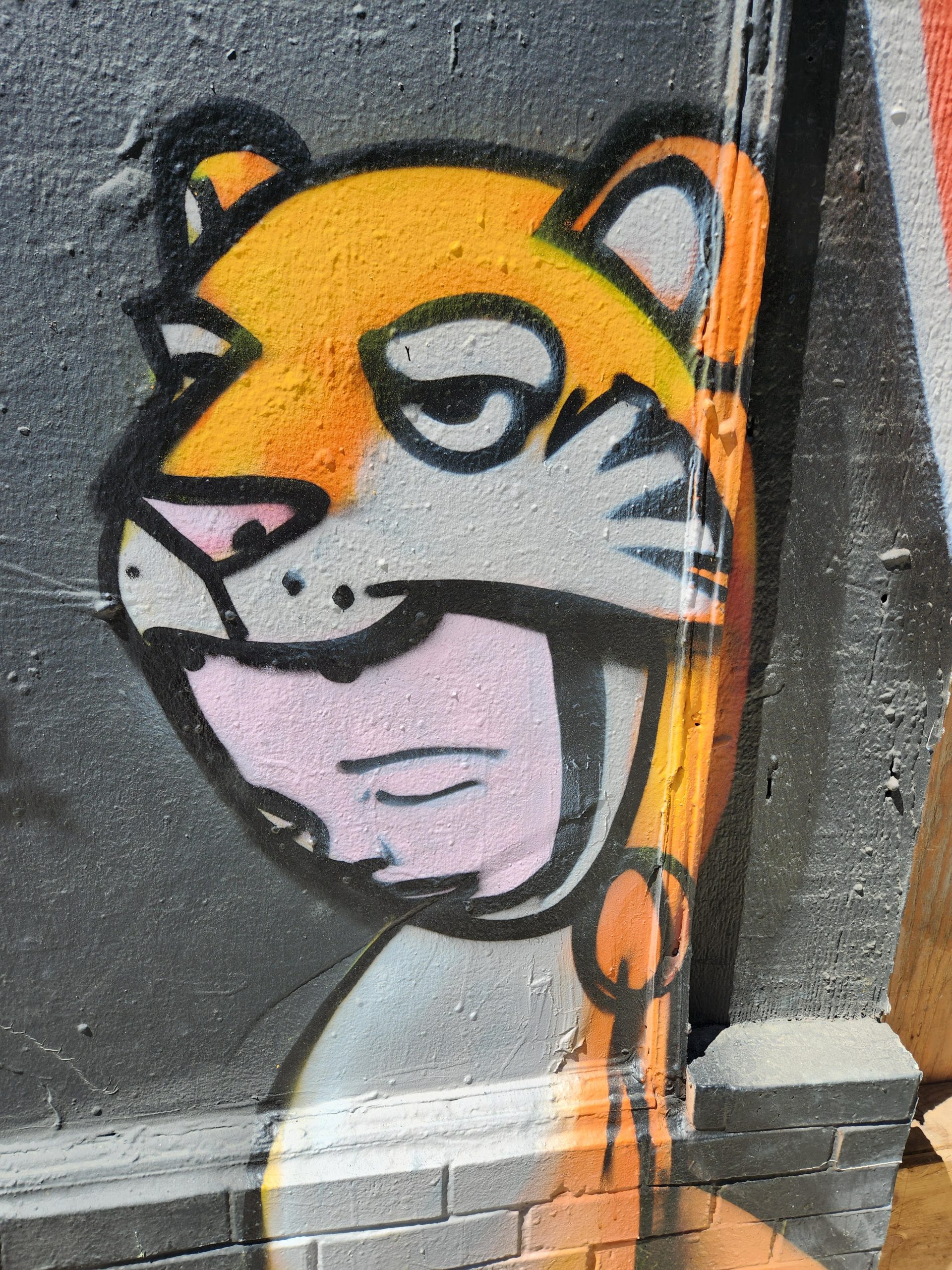 A mural on a concrete wall depicts a cartoon-style tiger face with vibrant orange, white, and black colors. The tiger has a mischievous expression and colorful shading.