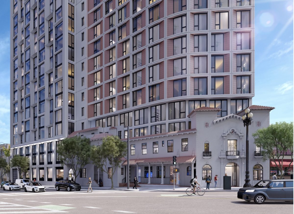 The project includes 98 two-bedroom units, 80 one-bedroom units, 12 studios, 10 three-bedroom units and 61 parking spots in an underground garage. It would replace a Mission Revival-style two-story commercial building currently on-site, but preserve the building’s facade.