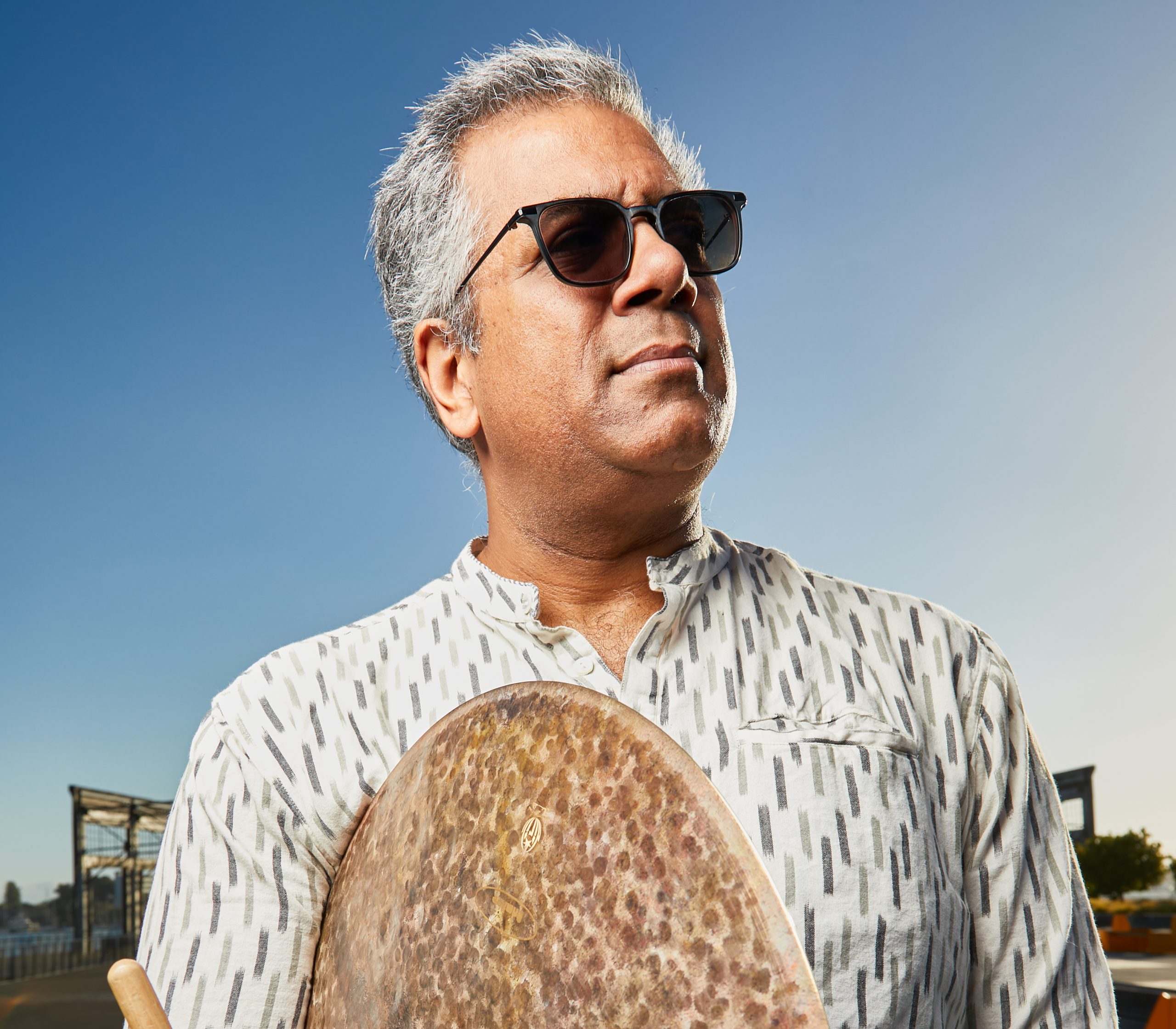 A man with gray hair and sunglasses holds a gong outdoors under a clear blue sky. He is wearing a white shirt with a black pattern.