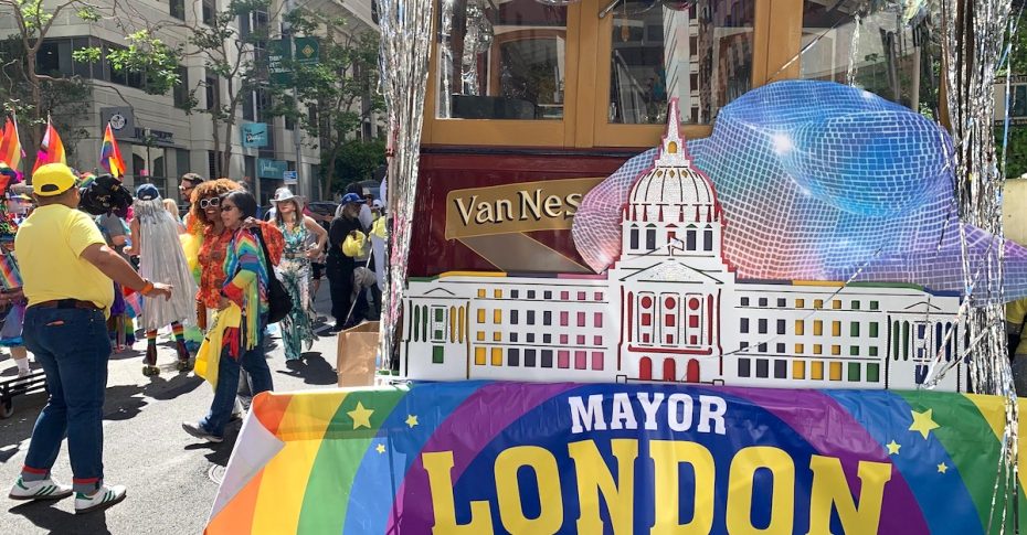 A few blocks away, past long rows of corporate floats (Playstation, Starbucks, Amazon with a truck theyโve modified to read โGlamazonโ), the subculture contingents (various leather groups, the very sweaty-looking NorCal Furries), the community groups and the nonprofits, sits the only Pride float belonging to a candidate who is allowed to use the word โmayor:” London Breed.