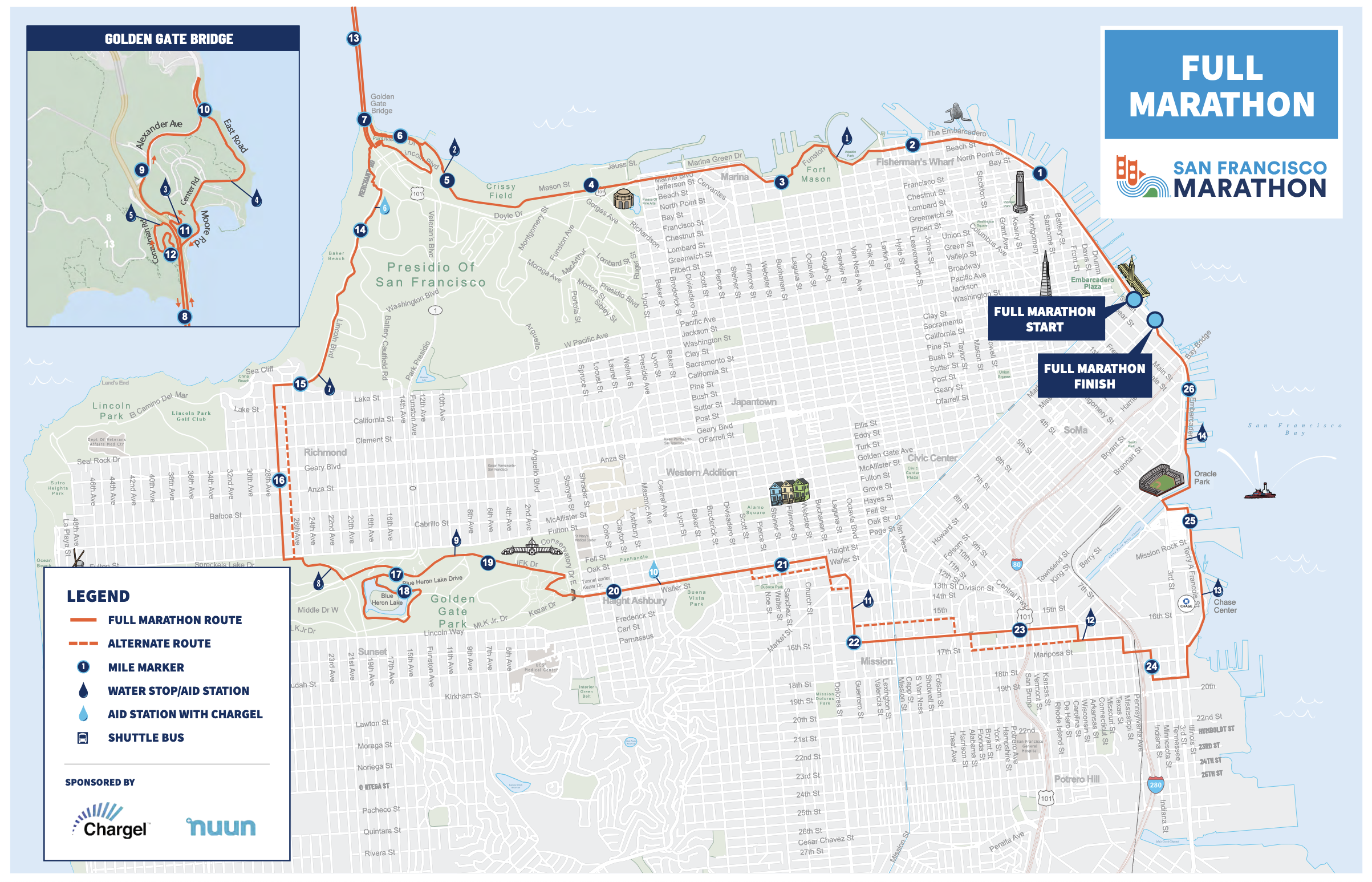 The 47th annual San Francisco full marathon kicks off Sunday morning at 5:15 a.m. Runners will start at Embarcadero and Market, follow the perimeter of the city through Fisherman’s Wharf and the Marina District and cross the Golden Gate Bridge and back before cutting east through the city to conclude near the starting point.