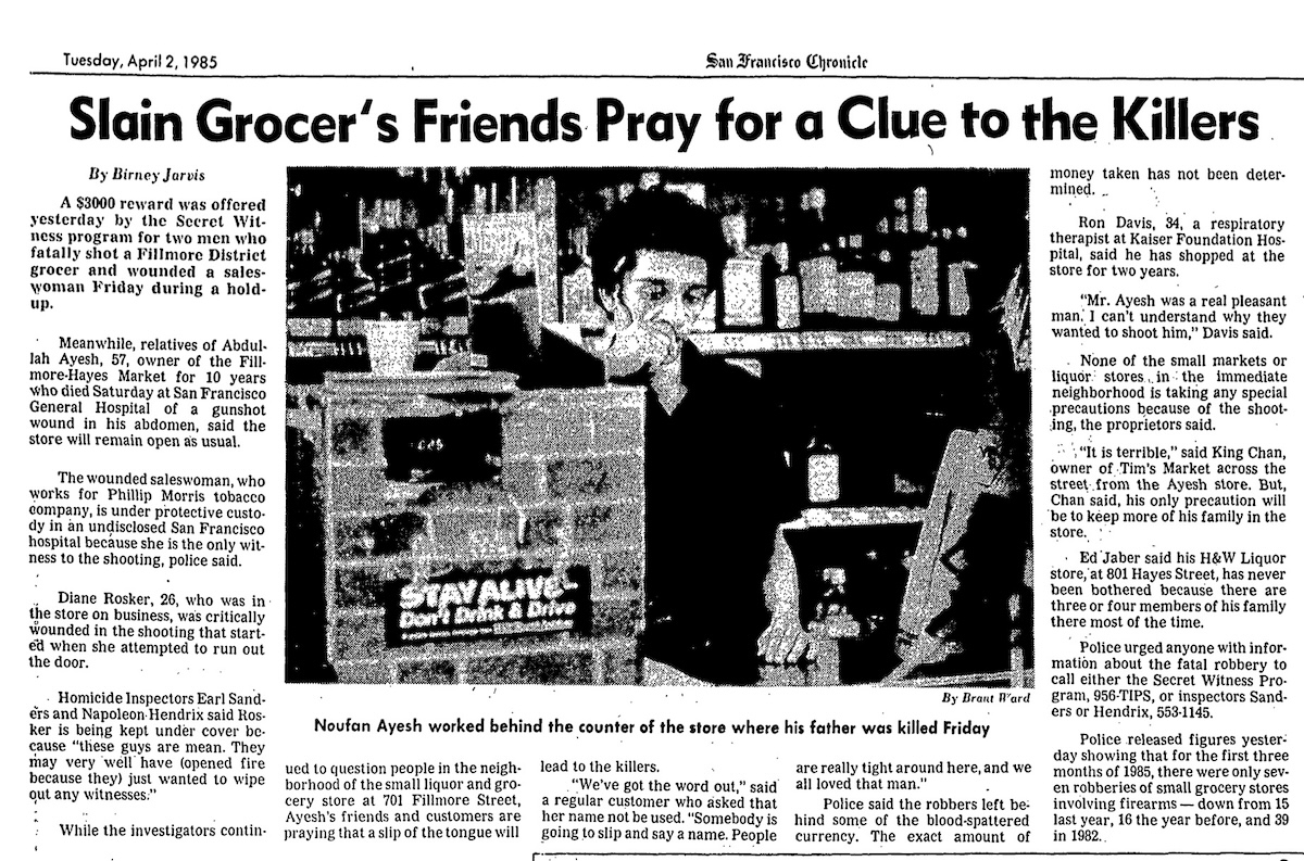 1984年,費城首次舉辦全國守望相助夜時,9歲的布里德正住在 Fillmore 區。當年《三藩市紀事報》的報導描繪了這樣的景象:「三藩市一夜兩起槍擊案 兩男子喪生」是1984年12月12日的頭條,報導了同一晚發生的兩起謀殺案,其中包括Fillmore St. 的 Gilmore’s 酒品店一名店員遇害。「奧克蘭謀殺案聽證會高度戒備 秩序良好」是同年的另一則報導,講述一名跆拳道教練在 Fillmore 的道館遇害。「雜貨店老闆遇害 親友祈求破案線索」則是1985年的報導,描述另一名 Fillmore 街角雜貨店店員被謀殺。