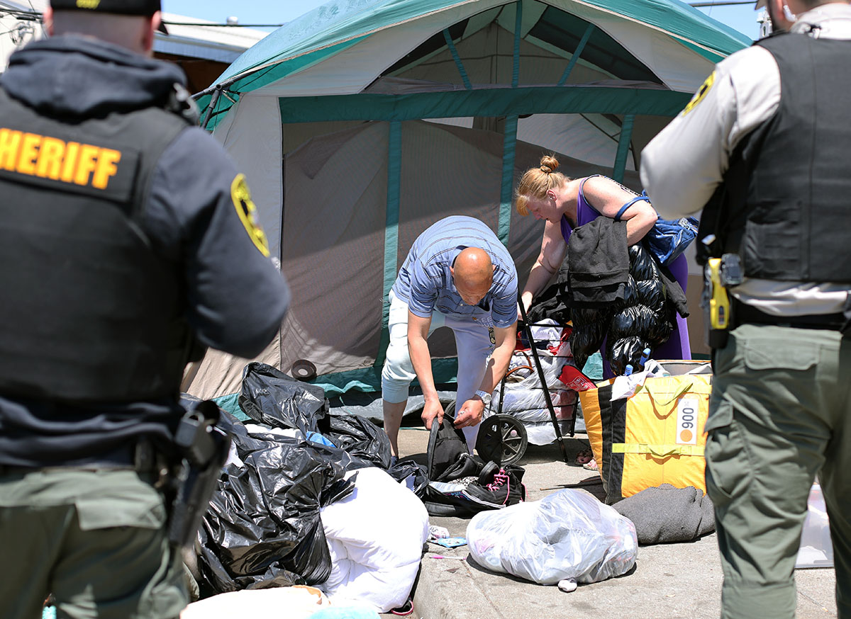 Near 8:10 a.m., four police cars and about a dozen Public Works trucks swarm into the five-block area, where about seven homeless residents have left or are still packing up. They descend upon on an encampment on Divison, right under Highway 101.