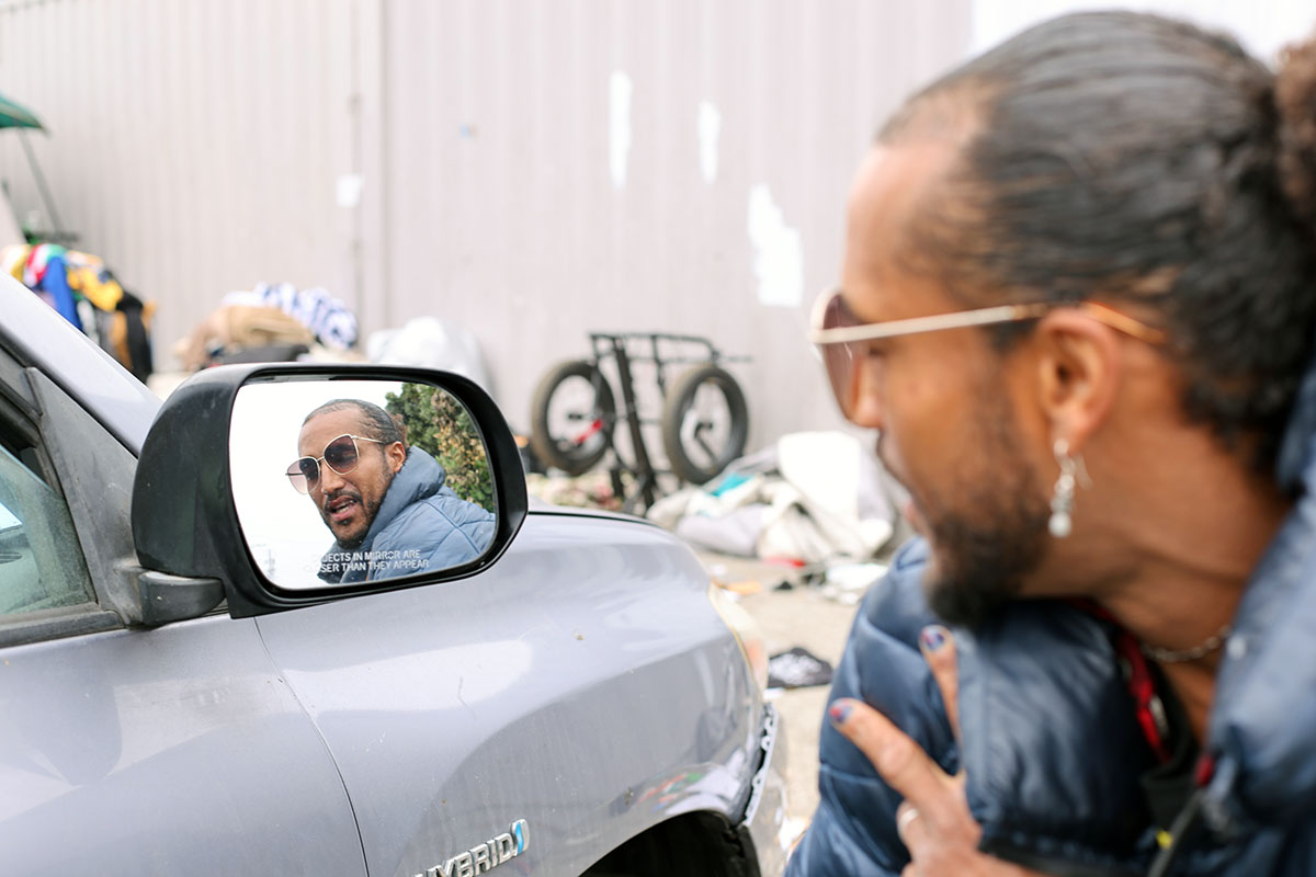 While we waited for the 1 p.m. sweep on Monday morning, Pinapplez demonstrated how he uses the rotated rear view mirror of a friend’s car to see himself practice fitness and dance routines he’s invented. From bins of donated clothes, he conjures outfits styled to his friends’ tastes. One friend, who lives in an encampment out of town but arrived that morning to help Pineapplez and others pack, described Pineapplez as “immaculate.”