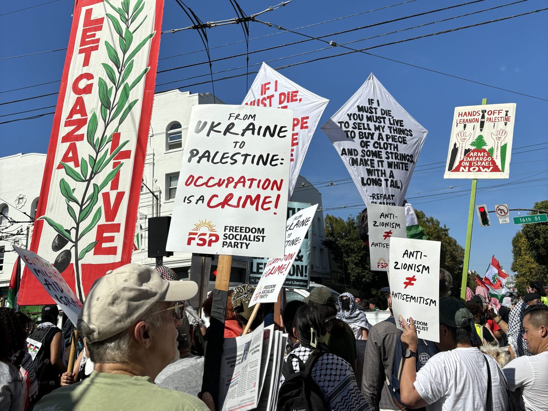 Thousands of pro-Palestine protesters gathered at 16th and Valencia streets on Sunday to march through the neighborhood, commemorating one year since the Oct. 7 Hamas attacks, and Israel’s bombardment and the invasion of Gaza that followed.