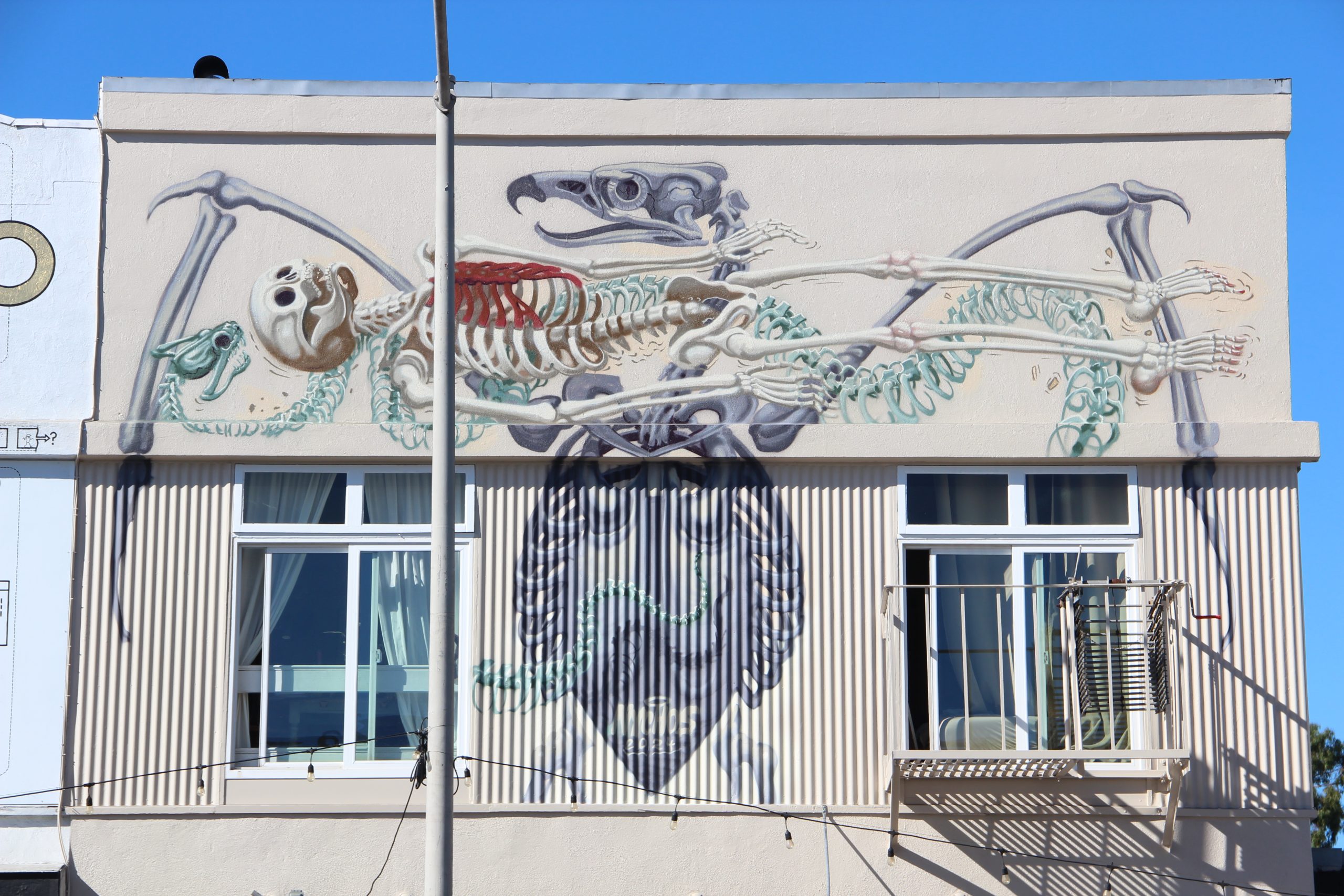 Nychos, who once lived in the Mission and generally produces murals featuring human and animal biology, painted the skeleton of a large bird with its wings wide open above the store’s entrance on Oct. 15. In the middle, there are two more skeletons: a human and a serpent lay horizontally around the bird’s chest.