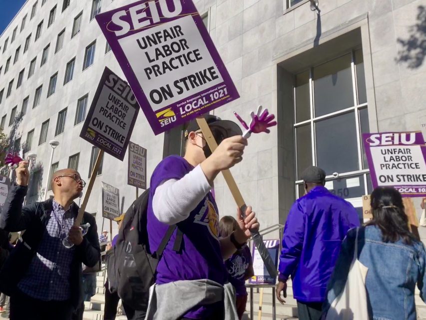 Dozens of court clerks with Service Employees International Union Local 1021 and their court-reporter and court-interpreter colleagues gathered outside the Hall of Justice at 850 Bryant St. on Thursday, chanting for better labor practices and bringing down the already backlogged San Francisco Superior Court.