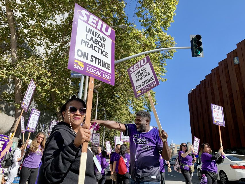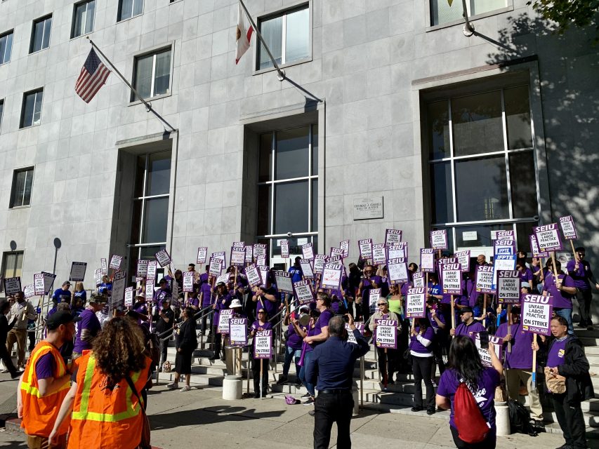 Around him, court clerks in purple and court reporters in blue chanted and waved signs in the middle of Bryant Street. A table nearby held flyers for those involved, and cardboard containers of coffee. Earlier that morning, workers said, the attorneys for Nima Momeni bought them a few hundred dollars’ worth of pastries from a nearby cafe.