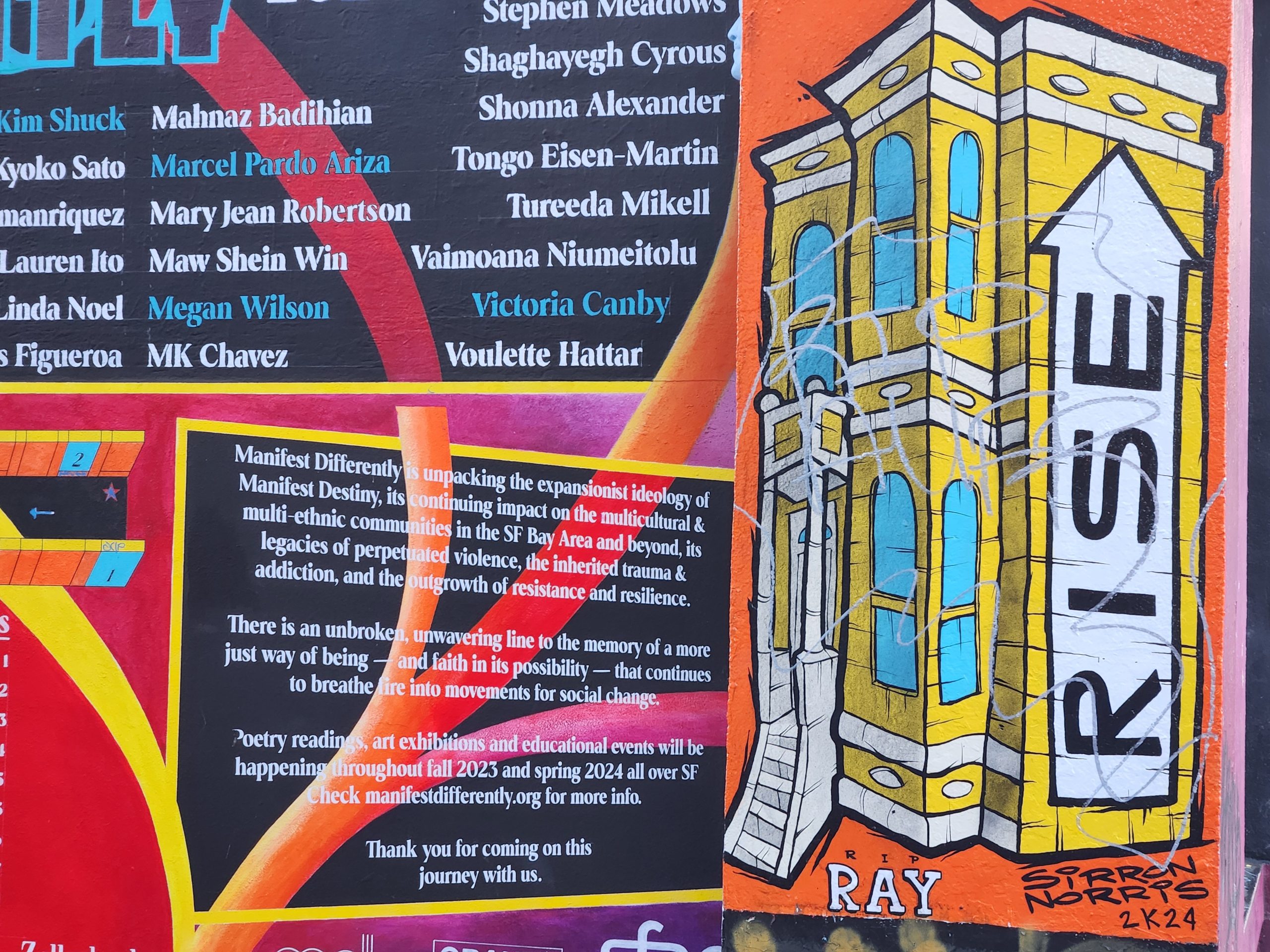 Colorful mural with a list of names, a cartoon building, and the word "RISE" in large text. Includes a paragraph about challenging the expansionist ideology of Manifest Destiny.