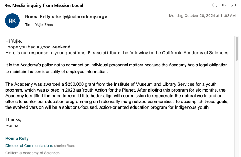 The Cal Academy’s leaders declined to provide details about how the other decisions were made. The museum issued a fuller statement after the the Nov. 21 Mission Local story was published.